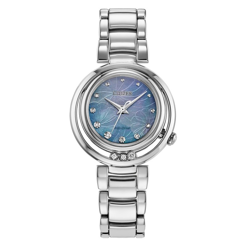 The Citizen L Arcly is a captivating addition of sustainable luxury. With�a design inspired by the original Citizen "Sunrise," this stainless-steel timepiece is a charming accent on the wrist that's perfect for glamorous wear, 29.8mm silhouette, a subtle 4 o'clock crown and 7 o'clock diamond accent. On its mother-of-pearl dial, applied diamond markers and sharp hands indicate the time in style atop a subtle flower motif, keeping the attention on the pure aestheticism of the timepiece.