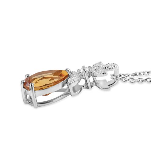 The image showcases an elegant pendant necklace featuring a pear-shaped citrine gemstone in a vibrant yellow hue. The citrine is held by a three-prong setting and dangles from a floral-inspired design adorned with small white topaz. The floral motif includes three marquise-shaped petals, giving the piece a delicate and nature-inspired look. The pendant hangs from a fine silver chain, enhancing its sophisticated appearance.