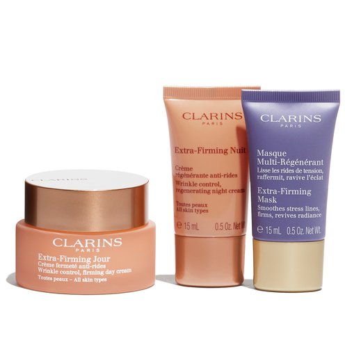 Discover Clarins� self care essentials for age-defying skin with this exclusive Limited Edition 3-piece Extra-Firming gift set�day and night creams that visibly firm & lift and a relaxing mask that visibly smoothes stress lines and restores radiance.
