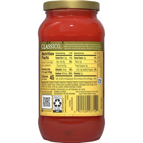 45 calories per 1/2 cup. No sugar added. Not a low calorie food. See nutrition information for calorie & sugar content. Make it yours for your homemade dish. Tomato and basil, the perfect staple for any meal occasion. Filled with real ingredients that help you create a homemade dish that's authentically delicious. Ready to be made yours.