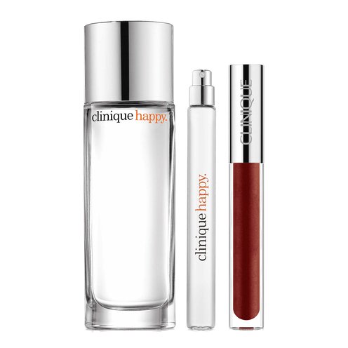 Shine happily. Two sizes of the citrus-floral perfume Clinique Happy™, plus a high shine hydrating lip gloss in shade Black Honey.