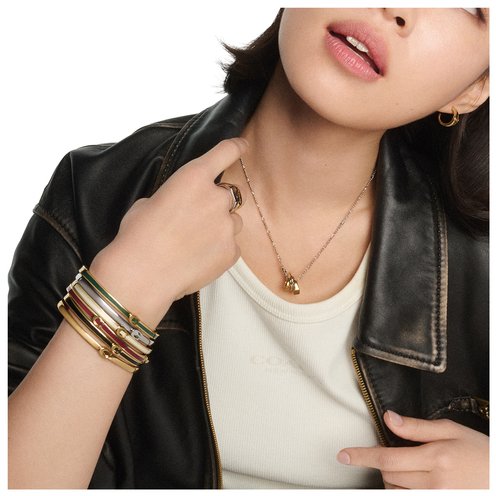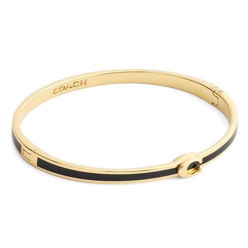 Minimal hinged bangle bracelet featuring signature sculpted C hardware at front perfect for everyday. Comes packaged in a signature COACH gift box. Bracelet has an easy hinge closure. Made from brass and enamel.