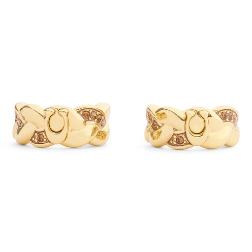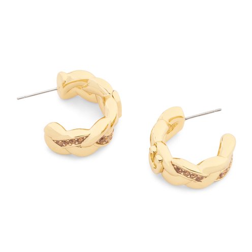 Refined braided texture hoop earrings featuring an open silhouette with signature sculpted C motif at front and minimal stones for a sparkly touch. Posts are made from hypoallergenic titanium perfect for everyday. Earrings have a post back closure. Made from brass, glass crystal and titanium.