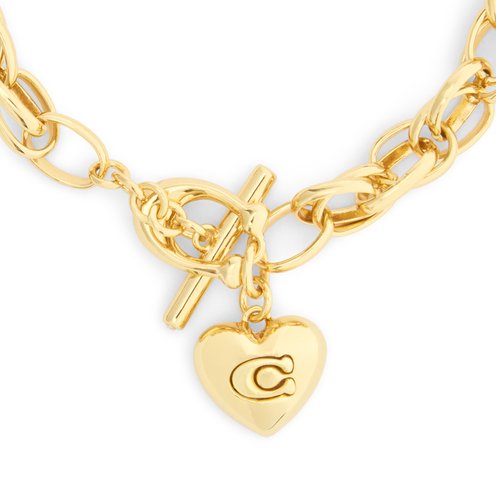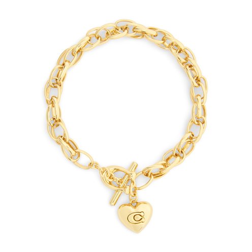 Refined interlocking chain link bracelet featuring playful puffy heart charm adorned with signature sculpted C motif and brushed finish perfect for everyday. Bracelet has an easy toggle closure. Made from brass.