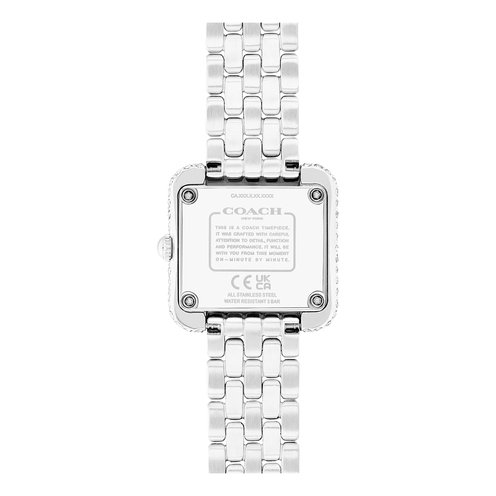 A bold square shape gives the Cass watch modern, distinctive style. This sleek stainless steel bracelet design sparkles with a snow-set crystal bezel and a silver white or gold dial detailed with glittering square crystals. It's finished with a crown cabochon.