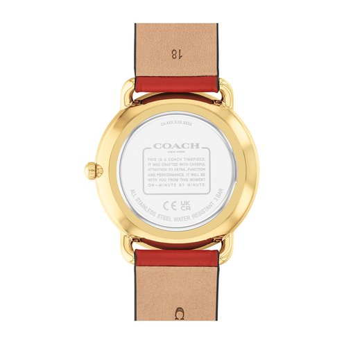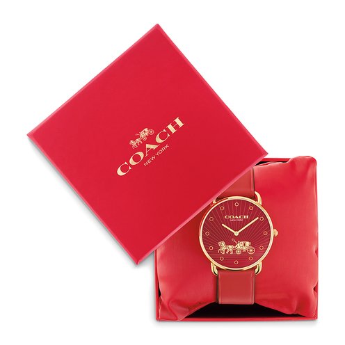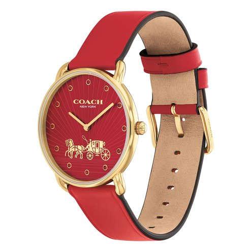 With clean lines and a modern minimalist sensibility, the Elliot is a true design classic ready for workdays and weekends. Celebrate 2026 Year of the Horse with Coach's special New Year watch. Finished with a red leather strap, the gold tone round timepiece features a red textured dial detailed with the iconic Coach Horse and Carriage motif and red crystal markers for a touch of shimmer.