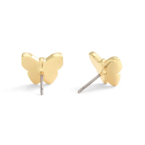 Sophisticated white enamel stud earrings featuring whimsical butterfly adorned with signature sculpted C motif, delicate stone and hypoallergenic titanium posts perfect for everyday. Earrings have a post back closure. Made from brass, enamel, glass crystal and titanium.
