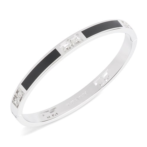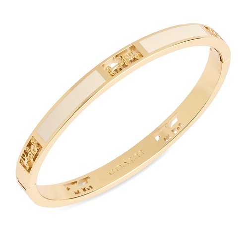 Everyday enamel hinged bangle bracelet featuring iconic horse & carriage motif cut outs. Bracelet has an easy push hinge closure. Made from brass and enamel. Includes signature COACH jewelry dustbag.