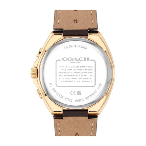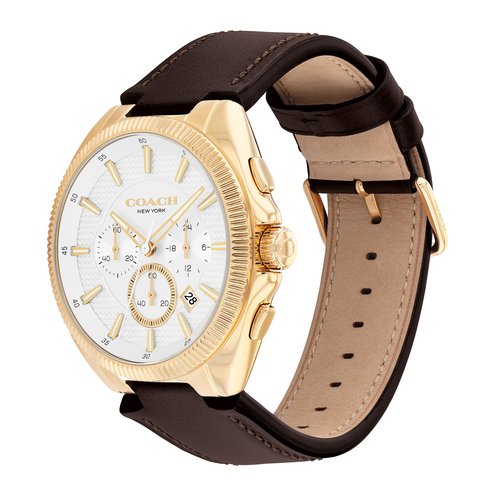 Combining discerning style with rugged functionality, Jackson is made for life on the move. Finished with a dark brown leather strap, this gold tone chronograph features a silver white dial with a date window and three subdials marking seconds, minutes and hours.