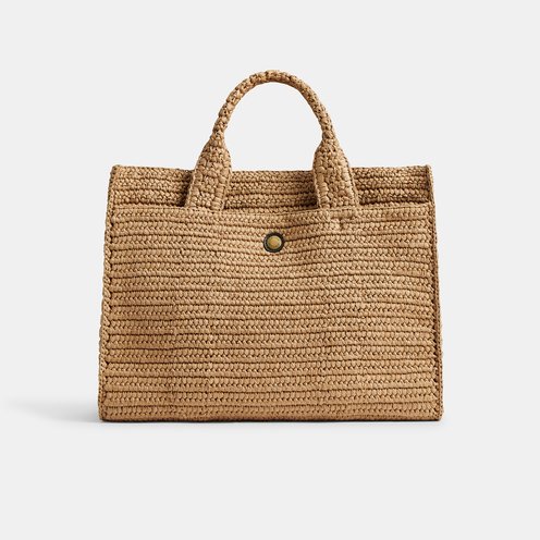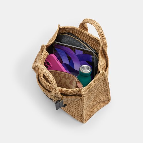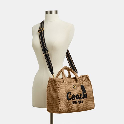 Carry as much (or as little) as you like with our lightweight Cargo tote. Detailed with our iconic turnlock closure, this spacious carryall has an open interior with room for a 13" laptop, two outside pockets for easy organization and a removable webbing strap for shoulder or crossbody wear. The versatile style is crafted of lightweight straw woven with a beautiful textural feel and finished with our embroidered straw cursive Coach script.