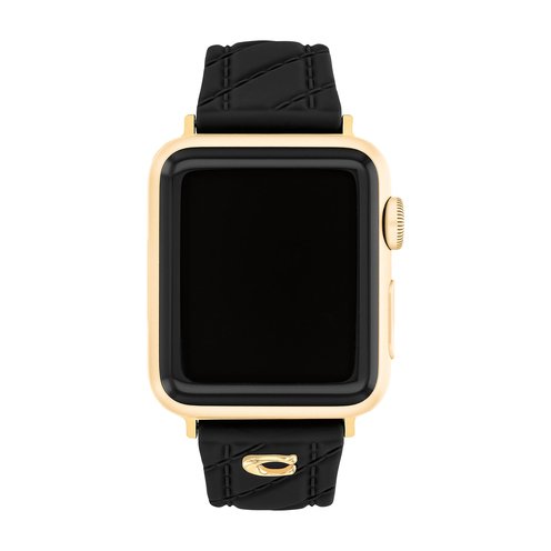 Made exclusively for use with the Series 9 and older 38/40/41mm and Series 10 42mm Apple Watch®, this black quilted silicone rubber strap is detailed with Coach Signature hardware for a heritage touch. It secures with gold tone hardware.