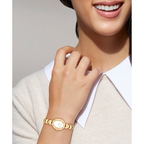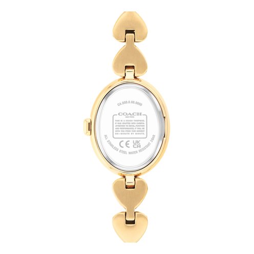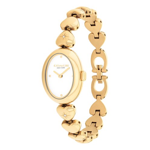 Designed with a modern minimalist sensibility, the Sammy is a refined timepiece perfect for everyday. Finished with a playfully romantic heart-link bracelet detailed with delicate crystals for a hint of sparkle, this gold tone watch features a white lacquer dial with polished dome markers. It secures with a Coach Signature clasp closure.