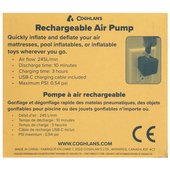 Inflate and deflate your air mattress, pool loungers, and more wherever you go. With Coghlan's Rechargeable Air Pump, you can quickly inflate your items directly in the tent, on the beach, or in the cabin without needing a power source. This lithium battery-powered air pump is ultra-portable and offers 10 minutes of inflation on a full charge. This USB-C rechargeable air pump can easily be charged to full strength in up to 3 hours using a wall outlet, power bank, or car charger. Three valve adapters are included, allowing you to use this portable pump of a variety of items.