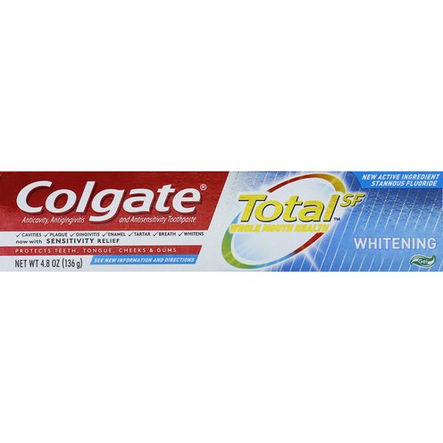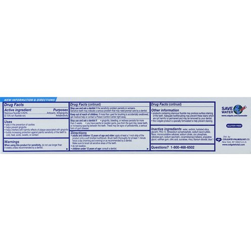 Products containing stannous fluoride may produce surface staining of the teeth. Adequate toothbrushing may prevent these stains which are not harmful or permanent and may be removed by your dentist. This Colgate product is specially formulated to help prevent staining. Misc: Cavities. Plaque. Gingivitis. Enamel. Tartar. Breath. Whitens. Now with sensitivity relief. Protects teeth, tongue, cheeks & gums. Whole mouth health (Helps reduce plaque that leads to gingivitis; fortifies enamel; helps relieve sensitivity with continued use.