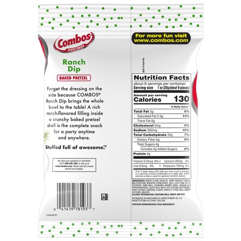Natural flavor. Per 1 Oz: 130 calories; 2.5 sat fat (13% DV); 350 mg sodium (15% DV); 4 g total sugars. Contains bioengineered food ingredients. Forget the dressing on the side because Combos Ranch Dip brings the whole bowl to the table! A rich ranch-flavored filling inside a crunchy baked pretzel shell is the complete snack for a party anytime and anywhere. Stuffed full of awesome.