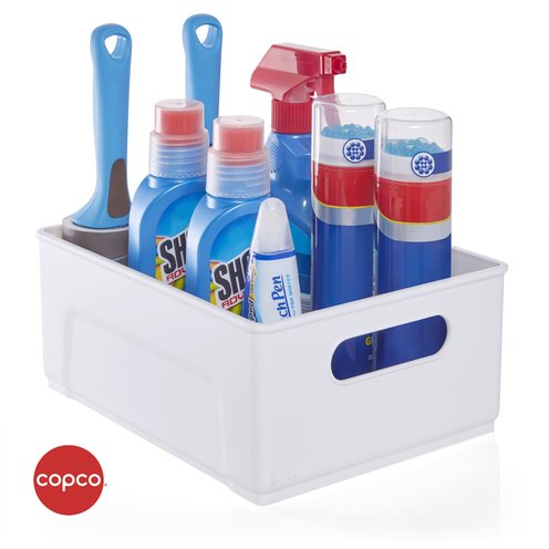 The Copco Cabinet Storage Bin keeps your home neat and organized. Ideal for dry foods, personal care products, cleaning supplies, and more, it makes items easy to access in cabinets, pantries, shelves, or under sinks. Built-in handles let you lift and carry effortlessly, while a nonslip liner and high walls keep contents secure.