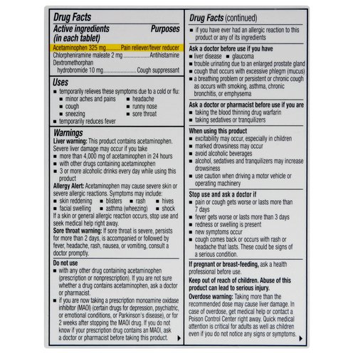 Warnings: Allergy alert: Acetaminophen may cause severe skin or severe allergic reactions. Symptoms May Include: Skin reddening; Facial swelling; Blisters; Asthma (wheezing); Rash; Hives; Shock. If a skin or general allergic reaction occurs, stop use and seek medical help right away. Liver warning: This product contains acetaminophen. Severe liver damage may occur if you take: more than 4000 mg of acetaminophen in 24 hours; with other drugs containing acetaminophen; 3 or more alcoholic drinks every day while using this product. Sore throat warning: If sore throat is severe, persists more than 2 days, is accompanied or followed by fever, headache, rash, nausea, or vomiting, consult a doctor promptly. Do not use: With any other drug containing acetaminophen (prescription or nonprescription). If you are not sure whether a drug contains acetaminophen, ask a doctor or pharmacist; if you are now taking a prescription monoamine oxidase inhibitor (MAOI) (certain drugs for depression, psychiatric or emotional conditions, or Parkinson's disease), or for 2 weeks after stopping the MAOI drug. If you do not know if your prescription drug contains an MAOI, ask a doctor or pharmacist before taking this product; If you have ever had an allergic reaction to this product or any of its ingredients. Ask a doctor before use if you have: liver disease; glaucoma; trouble urinating due to an enlarged prostate gland; cough that occurs with excessive phlegm (mucus); a breathing problem or persistent or chronic cough as occurs with smoking, asthma, chronic bronchitis, or emphysema. Ask a doctor of pharmacist before use if you are: taking the blood thinning drug warfarin; taking sedatives or tranquilizers. When using this product: Excitability may occur, especially in children; marked drowsiness may occur; avoid alcoholic beverages; alcohol, sedatives and tranquilizers may increase drowsiness; use caution when driving a motor vehicle or operating machinery. Stop use and ask a doctor if: Pain or cough gets worse or lasts more than 7 days; fever gets worse or lasts more than 3 days; redness or swelling is present; new symptoms occur; cough comes back or occurs with rash or headache that lasts. These could be signs of a serious condition. Pregnancy/breast-feeding warning: If pregnant or breast-feeding, ask a health professional before use. Keep out of reach of children. Overdose Warning: Taking more than the recommended dose may cause liver damage. In case of overdose, get medical help or contact a Poison Control Center right away. Quick medical attention is critical for adults as well as children even if you do not notice any signs or symptoms. Other warnings: Abuse of this product can lead to serious injury. Do not use if blister is cut or broken.