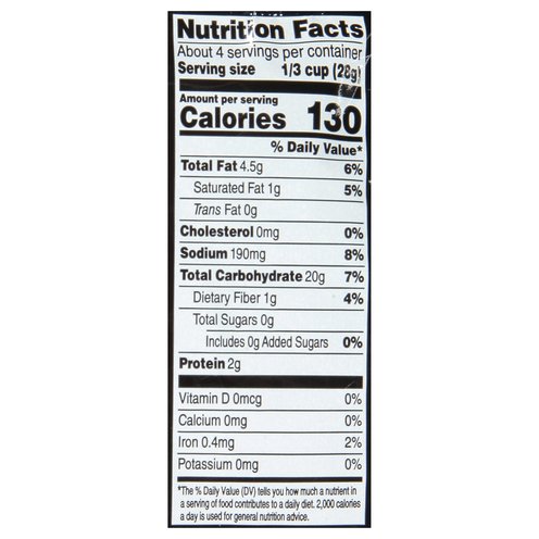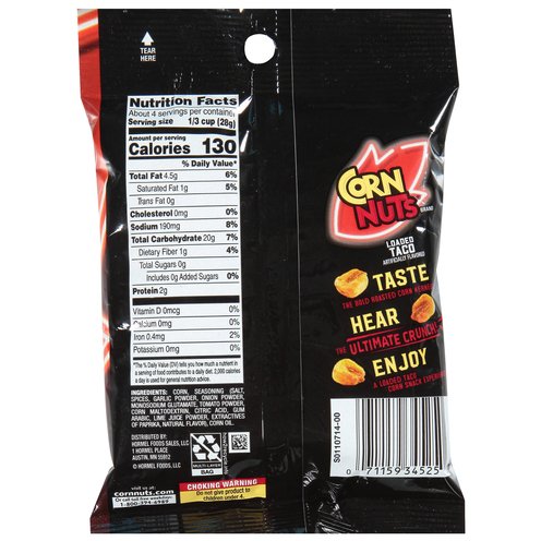 Artificially flavored. Per 1/3 Cup: 130 calories; 1 g sat fat (5% DV); 190 mg sodium (8% DV); 0 g added sugars (0% DV). Loaded taco. Taste the bold roasted corn kernel. Hear the ultimate crunch. Enjoy a loaded taco corn snack experience.