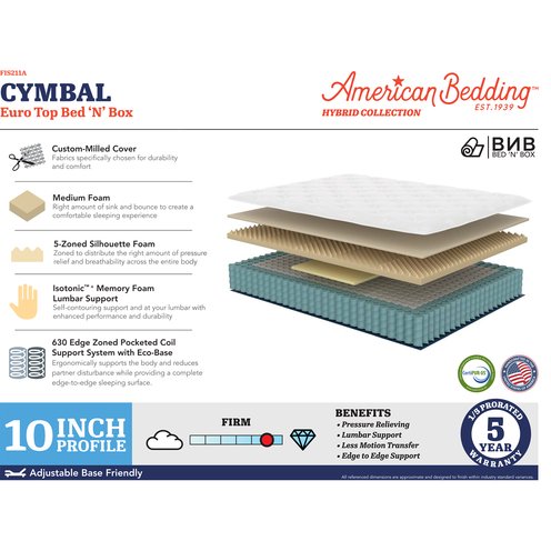 The American Bedding CYMBAL 10-Inch Hybrid Euro Top Bed in a Box Mattress is designed for quality and comfort for your best night's sleep at an affordable price. Ideal for side and back sleepers, the fully supportive pocketed coil design reduces motion transfer and relieves stress on pressure points while the self contouring memory foam layer provides a comfort level only a Hybrid can provide. The edge zoned pocketed coil system ergonomically supports the body and reduces partner disturbance while providing a complete edge to edge sleeping surface. The Isotonic memory foam layer provides extra lumbar support with enhanced performance and durability. A layer of 5-Zoned Silhouette foam distributes the right amount of pressure relief and breathability across the entire body. An additional layer of foam adds comfort with the right amount of sink and bounce to create a great sleeping experience so you wake up refreshed. The custom-milled fabric cover is stain resistant, durable and provides additional comfort. The CertiPUR-US certified foam is made without harmful chemicals or heavy metals, and contains low VOCs and no formaldehyde. The American Bedding 10-inch mattress is compatible with an adjustable base frame (sold separately). American Bedding hybrid mattresses come in Twin, Twin XL, Full, Queen, King and California King to complement any body size or type. Note: Your mattress may take a little time (24-48 hours) to grow to its optimum size after coming out of the box. Benefits of waiting a full 24-48 hours include expansion & ventilation. Sleeping on the mattress before the 48 hours will not impact the quality or comfort of your new mattress. Handcrafted with pride in the USA. Model: FIS211A.