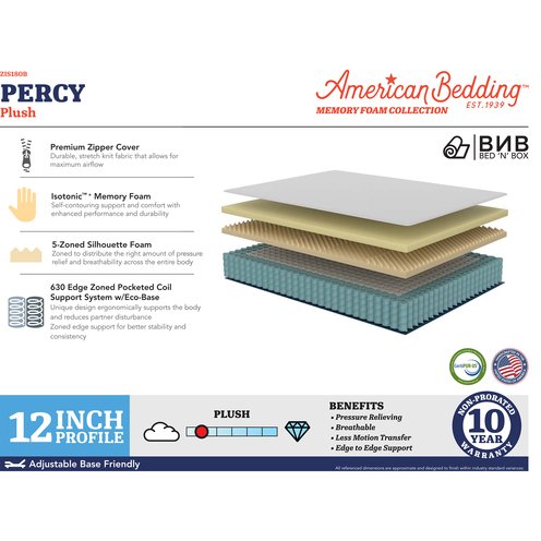 American Bedding mattresses are made with pride in the USA with state of the art material handling systems and upholstery equipment. All our products are tested for quality and are backed by our extended 10 year warranty. This Percy premium hybrid memory foam and spring plush bed in a box mattress delivers an immediate plush, soft feel while providing ergonomic support and is designed for quality, comfort and value for your best night�s sleep. This premium mattress is made with Isotonic memory foam which offers self contouring support with enhanced performance and durability. The edge zoned pocketed coil system ergonomically supports the body, relieves stress on body pressure points and reduces partner disturbance while providing a complete edge to edge sleeping surface. A layer of 5-Zoned Silhouette foam distributes the right amount of pressure relief and breathability across the entire body for a better nights sleep. The beautiful premium zipper cover is made from durable stretch knit fabric that allows for maximum airflow and breathability. CertiPUR-US certified foams are made without harmful chemicals or heavy metals, and contains low VOCs and no formaldehyde. Note:�Your mattress may take a little time (24-48 hours) to grow to its optimum size after coming out of the box. Benefits of waiting a full 24-48 hours include expansion & ventilation. Sleeping on the mattress before the 48 hours will not impact the quality or comfort of your new mattress. Model: ZIS180B
