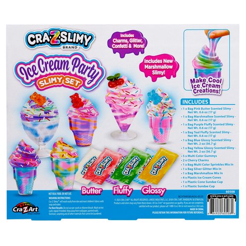 Get ready for sweet, squishy fun with the Cra-Z-Slimy Ice Cream Party Slimy Set! This exciting slime kit lets kids make their own colorful ice cream creations using 6 scented slime compounds, including butter, fluffy, glossy, and the brand-new marshmallow slime. With mix-ins like charms, glitter, and sprinkles, kids can decorate their slime sundaes and cones for endless creative play. The set includes plastic ice cream cups and cones to serve up your creations just like a real ice cream shop—without the mess or melting! Kids can stretch it, squish it, and swirl it into fun shapes while enjoying delightful scents. Perfect for birthdays, sleepovers, or screen-free playtime, this slime kit encourages imagination and hands-on fun. Designed for kids ages 6 and up, the Cra-Z-Slimy Ice Cream Party Slimy Set makes a great gift for slime lovers and creative minds. Just remember—it's for play only, not for eating!
