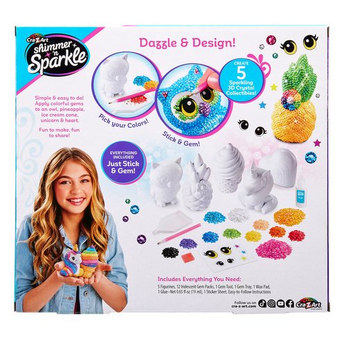 Shimmer ‘n Sparkle 3D Crystal Gem Creations, an innovative and artistic craft kit perfect for those ages 8 and up. Explore your creativity by crafting stunning, sparkly 3D gem collectibles, including an ice cream cone, pineapple, unicorn, heart, and owl. With 12 vibrant and iridescent gem colors to choose from, the possibilities are as endless as your imagination. The process is simple and enjoyable – select your desired colors, place the gems on the tray, and use the gem tool to bring your creations to life. See your exquisitely sparkling figurines that captivate from every angle. The kit also includes two sets of sticker eyes for the owl and unicorn, adding a delightful touch to your gem masterpieces. Ideal for birthdays, holidays, or creative sessions with friends and family, the Shimmer ‘n Sparkle 3D Crystal Gem Creations kit offers a unique and personalized crafting experience for kids. Immerse yourself in the world of dazzling gems, and let your artistic flair shine through!
