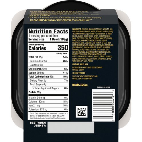 Seasoned with paprika & touch of ground mustard topped with toasted breadcrumbs. No artificial flavors or dyes. Per Bowl: 350 calories; 5 g sat fat (26% DV); 950 mg sodium (41% DV); 6 g total sugars. 4-1/2 mins. single bowl.