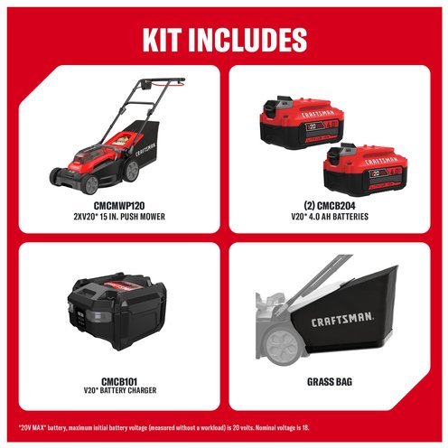 Kick the gas can to the curb and mow your lawn with the powerful 2XV20 15 in. Push Mower Kit. Powered by 2 reliable V20 batteries, this cordless solution is ideal for lawns up to 1/4 acre and delivers up to 45 minutes of runtime†. Featuring the fan-assisted 15 in. cutting system, this mower's efficient grass collection system helps fill its grass bag to its optimal capacity. At 36% more compact and 29% lighter weight, this mower can maneuver through tight spots and be easily stored in a crowded garage or shed. With a single-lever cut height adjustment and dial-control mulch door, this 2XV20* 15 in. Push Mower delivers enviable curb-appeal without the fuss of fuel.