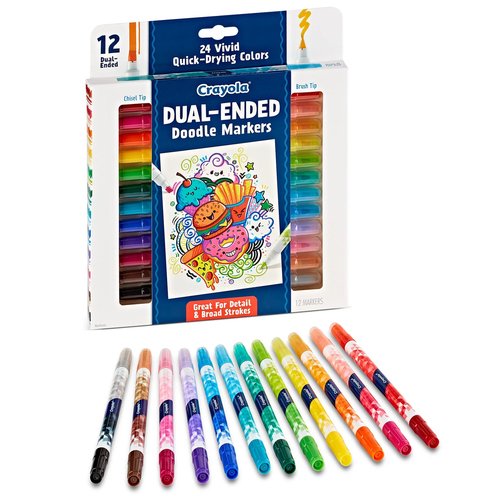 Create with definition and precision, thanks to a tool that offers twice the level of detail and twice the color. Each of the 12 Crayola Dual-Ended Colored Markers in this set feature two colorful tools in one! Create wispy watercolor-like areas of color with the brush marker end, or thick or thin lines with the chisel tip end. There are two colors per marker, giving you 24 colors total. These Crayola Markers make a great gift for teens with an interest in calligraphy, as well as those who just want to experiment more with versatile colored markers. Additional Doodle Markers and Colored Pencils are available (sold separately), try them all!