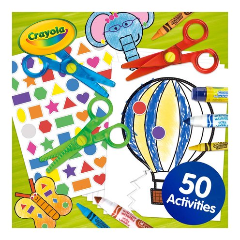 TODDLER SCISSOR SKILLS: Includes 3 Safety Scissors in 3 different shapes for a variety of toddler art projects: straight, wavy, and zigzag, a 50pg Scissor Skills Activity Pad (8.5" x 11"), 24 Ultra-Clean Washable Crayons, 8 Ultra-Clean Washable Markers, a Washable Glue Stick, 50 Stickers, and Googly Eyes.