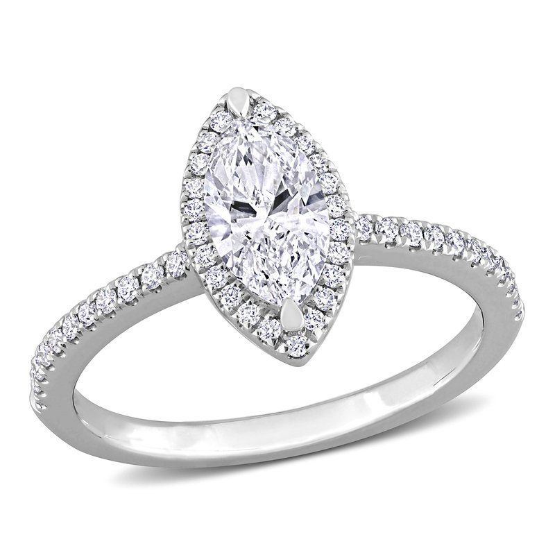 This magnificent 1 1/2ct TW marquise and round-cut lab-grown diamond halo engagement ring in 14k white gold epitomizes luxury and romance. The centerpiece features a stunning marquise-cut diamond, encircled by a halo of shimmering round-cut diamonds that amplify its brilliance. Set in a sleek 14k white gold band, the ring's design offers a timeless elegance that enhances the diamonds' natural sparkle. This engagement ring is a perfect symbol of enduring love and commitment, blending classic charm with modern sustainability for a truly unforgettable statement piece.