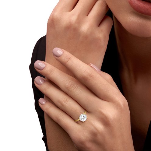 Bold in brilliance yet timeless in design, this engagement ring is a striking tribute to enduring love. The radiant sparkle of lab-grown diamonds finds the perfect balance against the warmth of 14K yellow gold, creating a look that feels powerful, elegant, and deeply meaningful. A piece that honors your story with grace and grandeur.