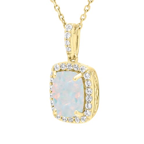 Be ready for the compliments you receive when you wear this alluring lab-created Opal pendant. Finished in sterling silver with yellow gold flash plating, this choice feature an 8.0x6.0 cushion-shaped lab-created Opal cabochon surrounded with lab-created white sapphire. This pendant is suspended on an 18-inch diamond cut cable chain with lobster clasp.