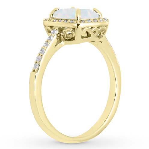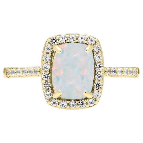 Be ready for the compliments you receive when you wear this alluring lab-created Opal ring. Finished in sterling silver with yellow gold flash plating, this choice feature an 8.0x6.0 cushion-shaped lab-created Opal cabochon surrounded with lab-created white sapphire.