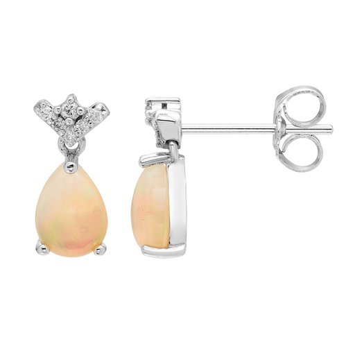 She'll adore the gorgeous color of these fashion earrings. Crafted in sterling silver, showcases a 7.0x5.0mm pear-shaped lab-created iridescent opal cabochon with lab-created white sapphire accent. These earrings secure comfortably with friction backs.