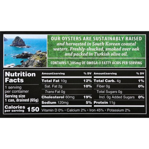 Hand packed in olive oil. Quality natural seafood. From managed fisheries. Our oysters are sustainably raised and harvested in South Korean coastal waters. Freshly-shucked, smoked over oak and packed in Turkish olive oil. Non GMO Project verified. Certified Paleo. Contains 1,305 mg of Omega-3 fatty acids per serving. The occasional green appearance in oysters is natural and not considered harmful. Product of South Korea.