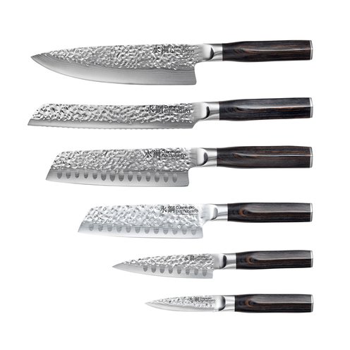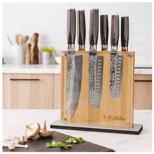 Slice and dice with ease using the Cuisine::pro® Damashiro® Emperor Shi Knife Block 7 Piece. Cuisine::pro® Damashiro® Japanese knives are made from the finest quality Japanese steel. Inspired by traditional Japanese craftsman and Samurai sword makers, these knives are characterized by distinctive traditional inspired Damascus on the blade of banding and mottling reminiscent of flowing water. Damashiro® blades are made from specialist ice hardened Japanese steel which makes them super tough, resistant to shattering and capable of being hones to a sharp resilient edge. The Cuisine::pro® Damashiro® Emperor Shi Knife Block 7 Piece features 6 essential blades that are housed in a stunning bamboo block, with a protected view of the impressive blades.