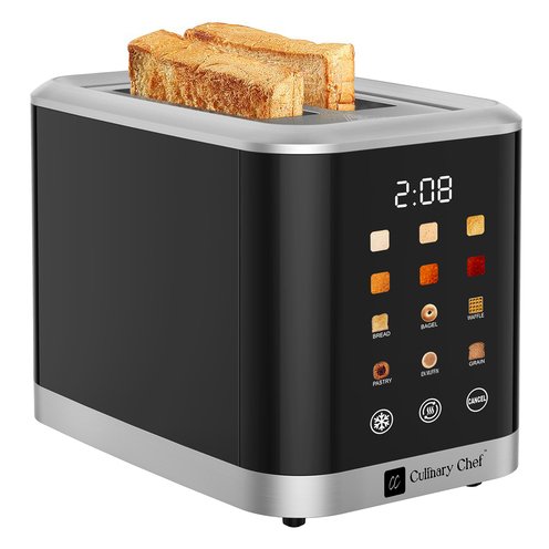 Cooking a bagel has never been easier with a powerful 800-watt toaster that's equipped to handle all of your toasting needs. Designed to accommodate a variety of breads, two large toasting slots provide ample room for toasting everything from thick slices of bread to bagel halves. Adjust the doneness by choosing from six browning levels for lightly or darkly toasted bread. Also featured are defrost and cancel options, along with a bagel button that automatically adjusts the toasting time for thicker breads like bagels and English muffins. Each control button illuminates when pressed for easy recognition.