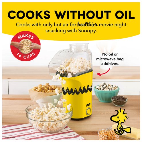 Get things popping with the Peanuts Fresh Pop Popcorn Maker! The Fresh Pop cooks using only hot air for healthier movie night snack without oil or microwave bag additives and preservatives. Pop up to 16 cups of fresh popcorn at one time, the perfect size for snacking solo or for a Peanuts watch party. The included Measuring Cup ensures perfect portions and doubles as Butter Melting Tray place on top during cooking to melt butter for easy drizzling! And it's so easy to use get poppin' with just one touch! Cute and compact, it's the ideal movie night sidekick for smaller spaces. Plus, our Recipe Guide is packed full of fun ideas to keep the Peanuts party going!