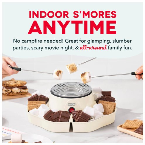 Experience the magic of campfire nights right in your kitchen with the Dash S'Mores Maker! This electric, smokeless heater allows you to easily roast marshmallows and create delicious s'mores without needing an outdoor fire. Setting it up for parties and family gatherings is a breeze. Whether you're glamping with friends or enjoying a cozy family night, you can quickly bring s'mores to the party for a delightful treat. The Dash S'Mores Maker features four detachable Serving Trays that keep all your ingredients organized for easy snacking. The included stainless steel Roasting Forks ensure safe and fun roasting for everyone. Simply hold the Roasting Fork over the heating element and watch as the marshmallows roast, turning slowly for that perfect caramelization. Once the indoor campfire is done, disassembly is simple, making cleanup quick and easy. The Dash S'Mores Maker turns every gathering into a delightful celebration of flavor and connection. Check out the included Recipe Guide to unleash even s'more fun and make your home the sweetest place to be!