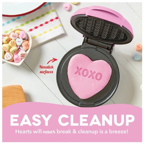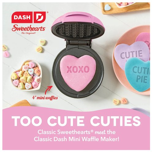 The Dash x Sweethearts Mini Waffle Maker brings the iconic Sweethearts Candy straight to your kitchen in waffle form. Perfect for Valentine's Day breakfasts, a sweet surprise for your beloved, or the highlight of fun family festivities they're sure to love! Dual nonstick surfaces cook and heat quickly and evenly and release waffles cleanly. Heart-shaped waffles are ready to decorate and easy to share, perfect for spreading the love even when Cupid's not in town. Get ready to dive into our Recipe Guide, brimming with ideas that'll help you say "You're the syrup to my waffles" in the most flavorful ways imaginable!