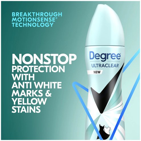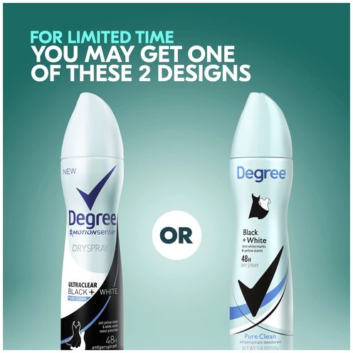 Degree is upgrading to our best formula yet. Our new and improved formulation gives you 72 hours of nonstop sweat and odor protection. You will still find all the same fragrances you know and love, but now with our new and improved long lasting protection! For a limited time, you may still receive our old 48-hour formulation while all our new 72-hour products make their way to a store near you. For the details of these changes, scroll down to see a full list of ingredients. Arrive in style with Degree UltraClear Black+White Pure Clean Antiperspirant Deodorant. This antiperspirant features 72-hour sweat and odor protection, anti-white mark, and anti-yellow stain technology. With no white marks on black clothes and no yellow stains on white clothes, youll look great and feel confident. Only Degree has MotionSense technology that moves in sync with your body. This antiperspirant deodorant for women releases a burst of subtle fragrance every time you move for nonstop protection. This antiperspirant deodorant for women with a refreshing, airy scent gives you the confidence to keep moving all day long. Degree UltraClear Black+White Pure Clean keeps you feeling cool, fresh and protected from sweat and odor. Degree UltraClear Black+White Pure Clean antiperspirant deodorant keeps you feeling fresher, drier, and more confident. This powerful antiperspirant deodorant spray responds when you need it most so that you can stay confident without having to worry about slowing down. Degree UltraClearBlack+WhitePure Clean also comes in a convenient dry spray. At Degree, were doing everything we can to help keep the planet moving. Thats why our antiperspirant deodorant dry spray cans are made with infinitely recyclable aluminum. Whatever you do, however you do it, Degree wants to help inspire the confidence in you to move more, and with this antiperspirant deodorant, itll provide you the confidence that sweat and odor will not get in your way of your progress. Degree. It wont let you down.