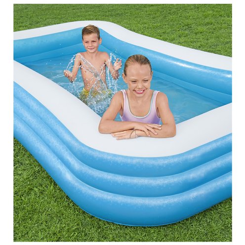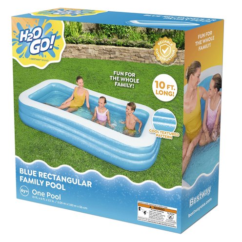 Splash into some refreshing memories with the H2OGO!® Blue Rectangular Family Pool! Designed to get kids (and adults) out of the house, it features a textured pattern on the side walls and puts the focus back on fun! The rectangular pool is 10 ft. long with a water capacity of 307 gal. (1,161 L) and has extra-wide side walls for stability. The pool is great for families with young children to splash and play in the sun. Plus, taking it down is a breeze with the easy to use drain valve, so it can be drained and stored for many splashy seasons to come. Add more smiles, laughs and splashes to your summer with the H2OGO! Blue Rectangular Family Pool!