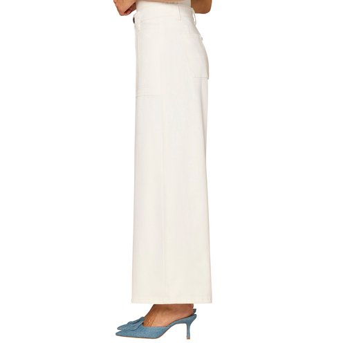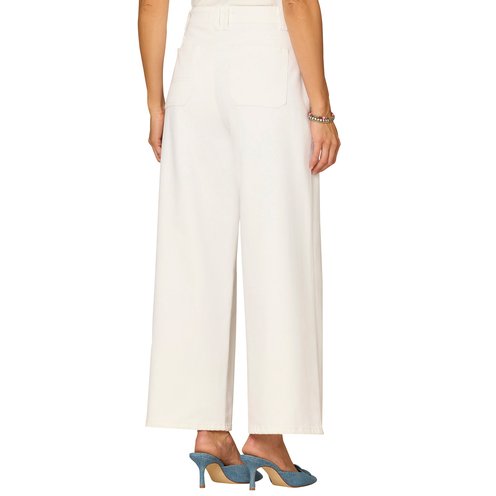 The white wide-leg jean is fitted through the hips with a relaxed, wide opening through the legs.