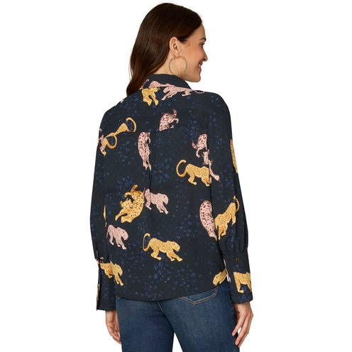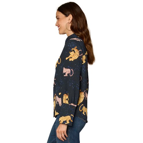 Polished precision comes effortlessly with this woven top. It's designed with long French cuff band sleeves, a pleated button down front, hi-low hem, and a fun animal print for a pop of personality.
