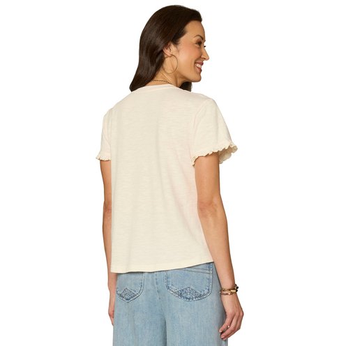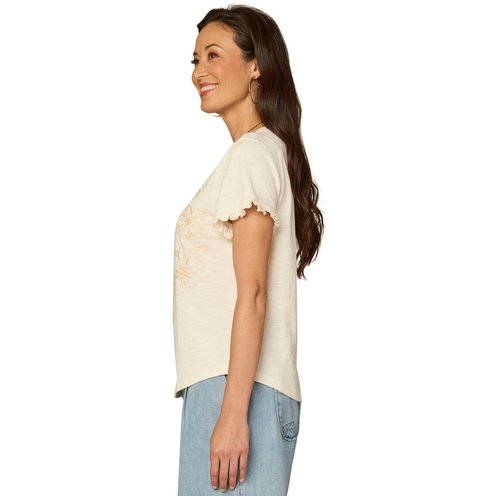 A clean and crisp classic, this knit top goes with everything. It's designed with short ruffle sleeves, a crew neck, and an embroidered front with a floral design for visual interest.