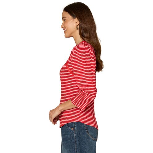 Cool, classic, and perfect for casual occasions, this striped knit top makes getting dressed a breeze. It has three quarter puff sleeves, a boat neck, and intricate crochet detailing.