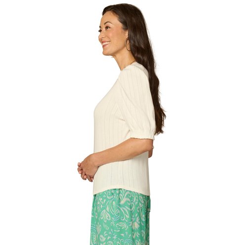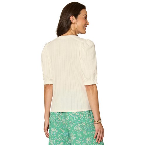 This knit top features elbow puff sleeves, a mandarin V?neck collar, and delicate embroidery details. The slightly sheer open?work fabric makes it perfect for layering.