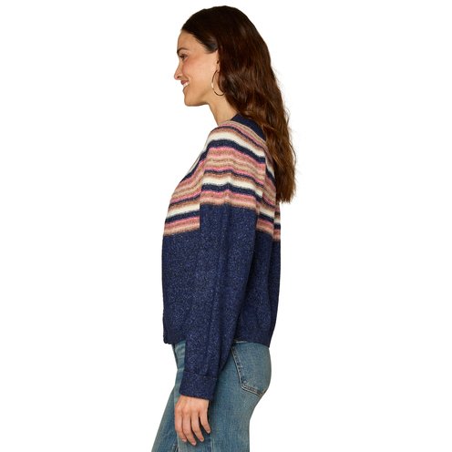 The perfect throw-on-and-go layer, this sweater cardigan is going to be a repeat style in your wardrobe. It features long raglan sleeves, a round neck, hidden snap front, and abstract placement multi color stripes.