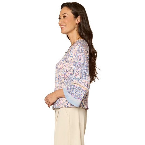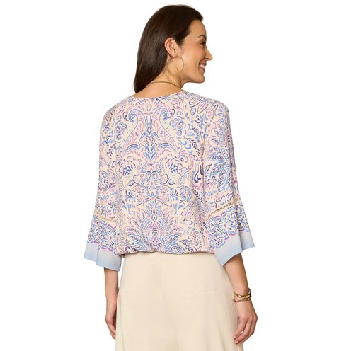 This knit top features three?quarter kimono sleeves with crochet detailing, a graceful boat neckline, and a soft bubble hem. The lightweight, breezy fabric is finished with an abstract placement print for effortless visual interest.